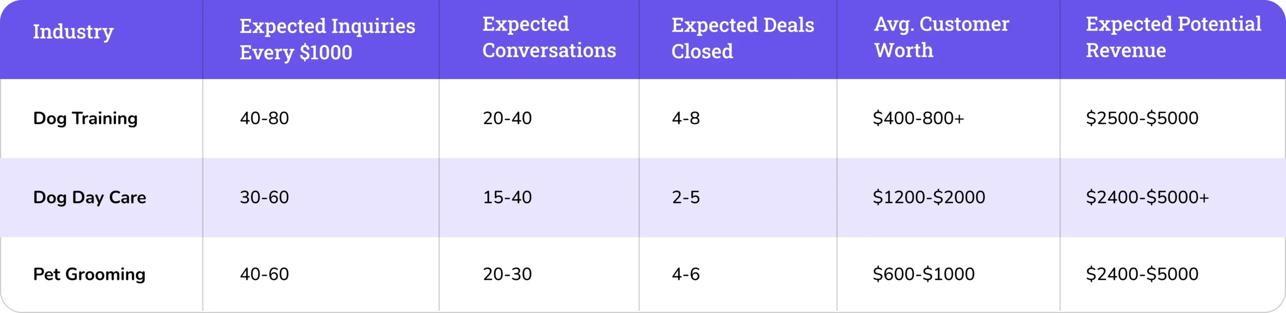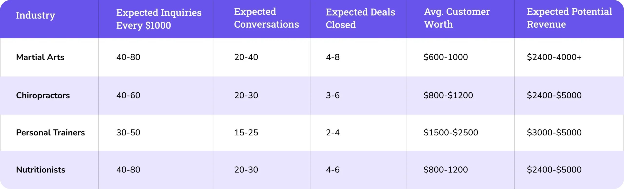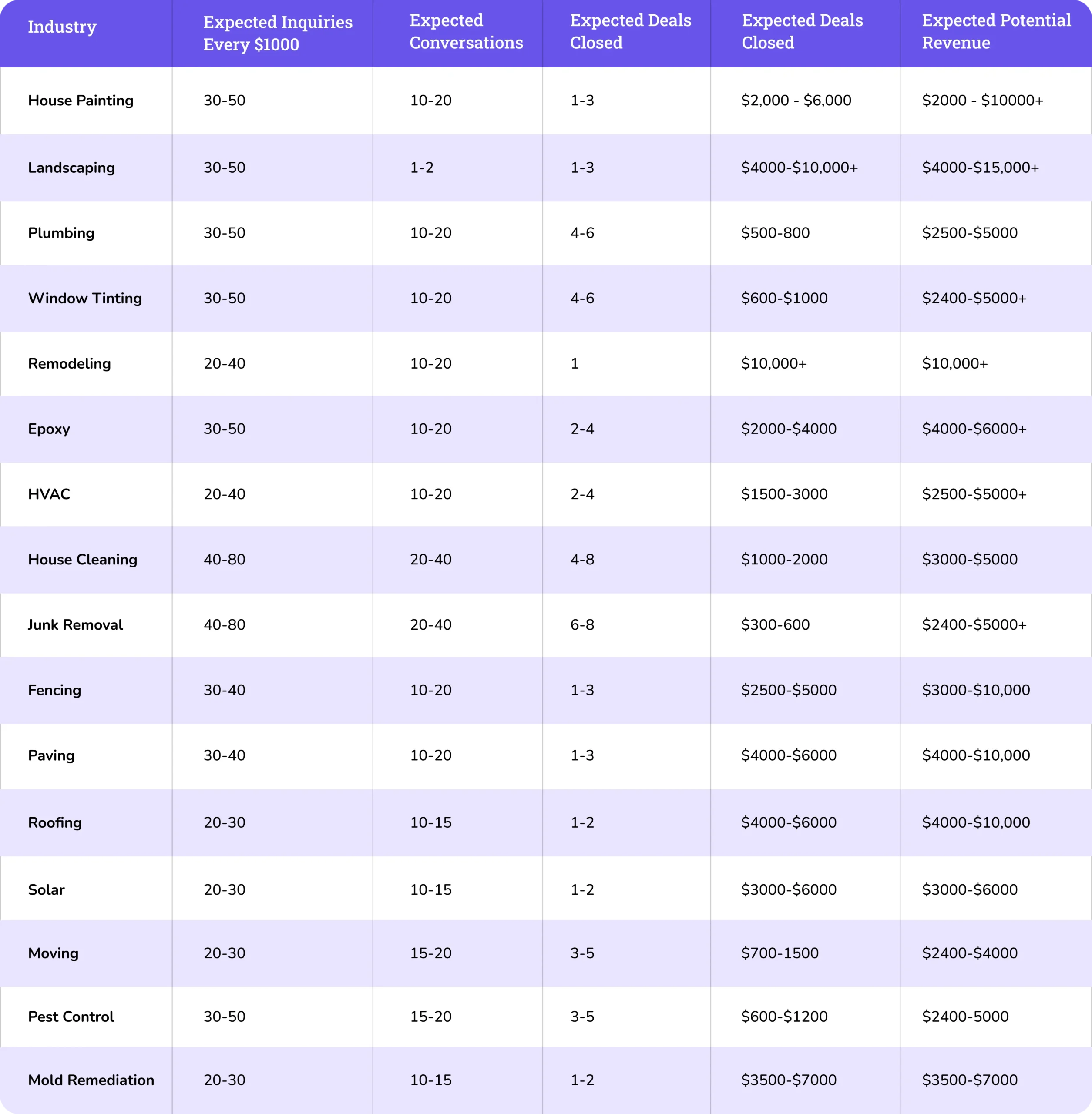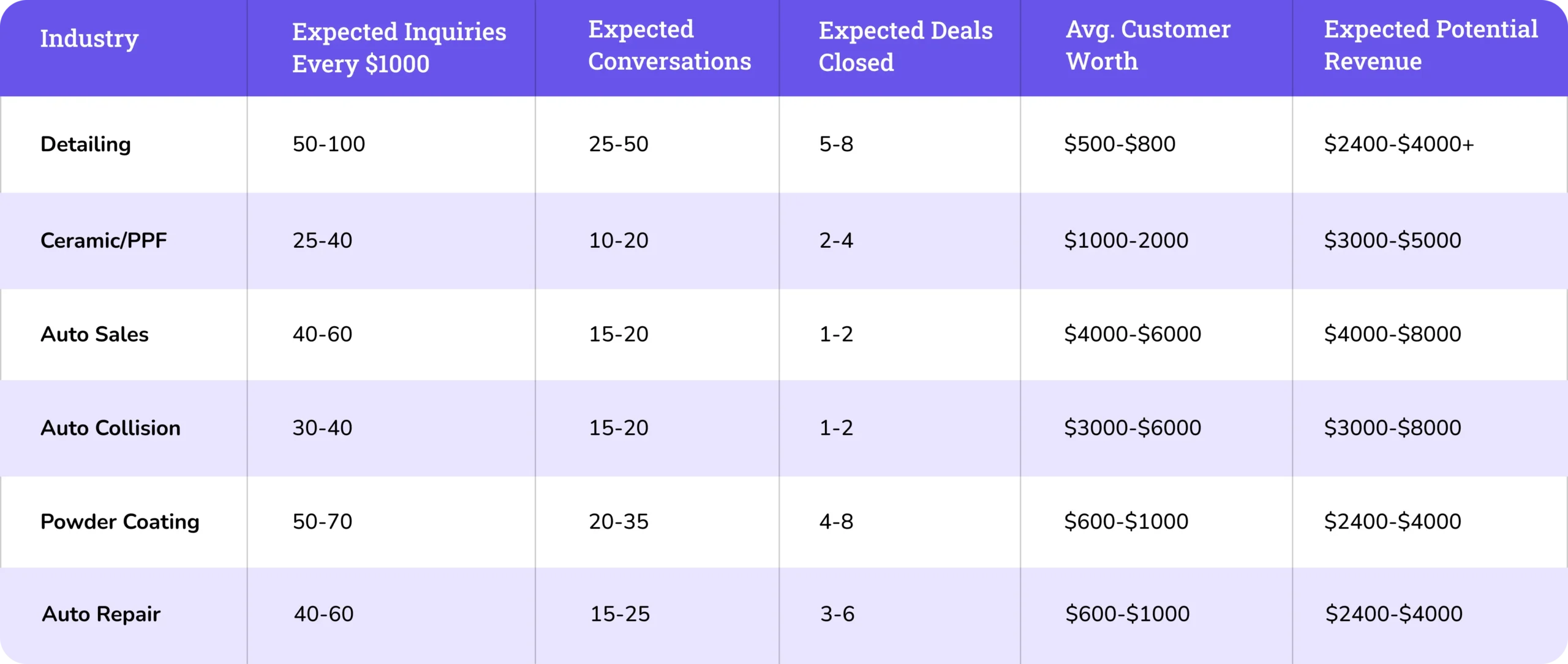 | Industry | Expected Inquiries Every $1000 | Expected Conversations | Expected Deals Closed | Avg. Customer Worth | Expected Potential Revenue |